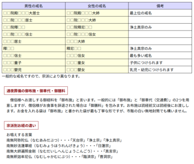 | 通夜・葬儀・式中初七日・火葬・戒名(信士・信女・釋・釋尼の位) |